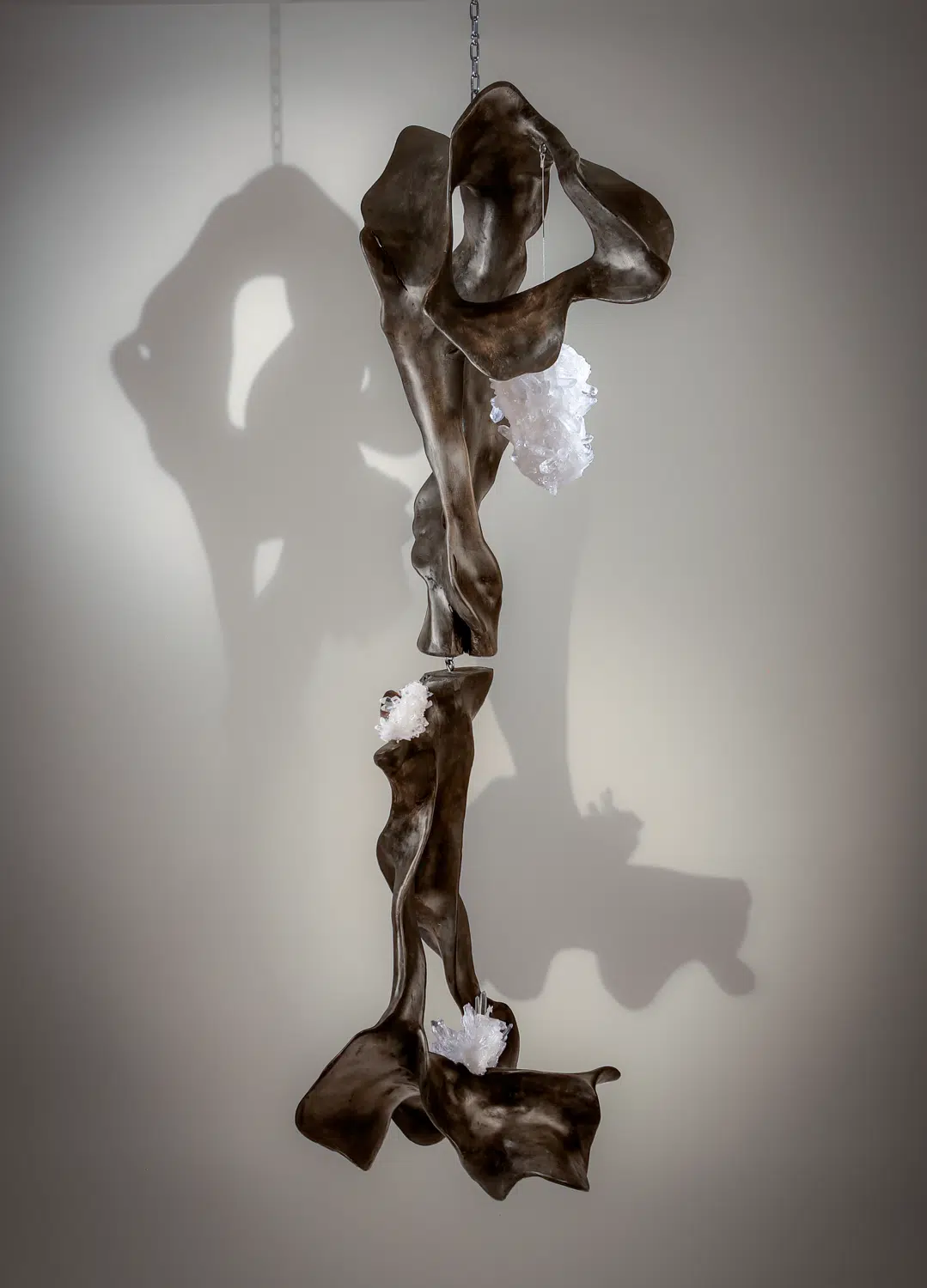 Divine Balance features Hanging Stained Teak Wood, known for its grounding and stabilizing qualities. The natural beauty of the wood combines with the tranquil energy of the piece to create a sense of harmony and peace. This sculpture invites balance and serenity into any space, making it a perfect addition to environments focused on mindfulness and emotional well-being.