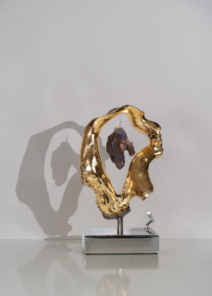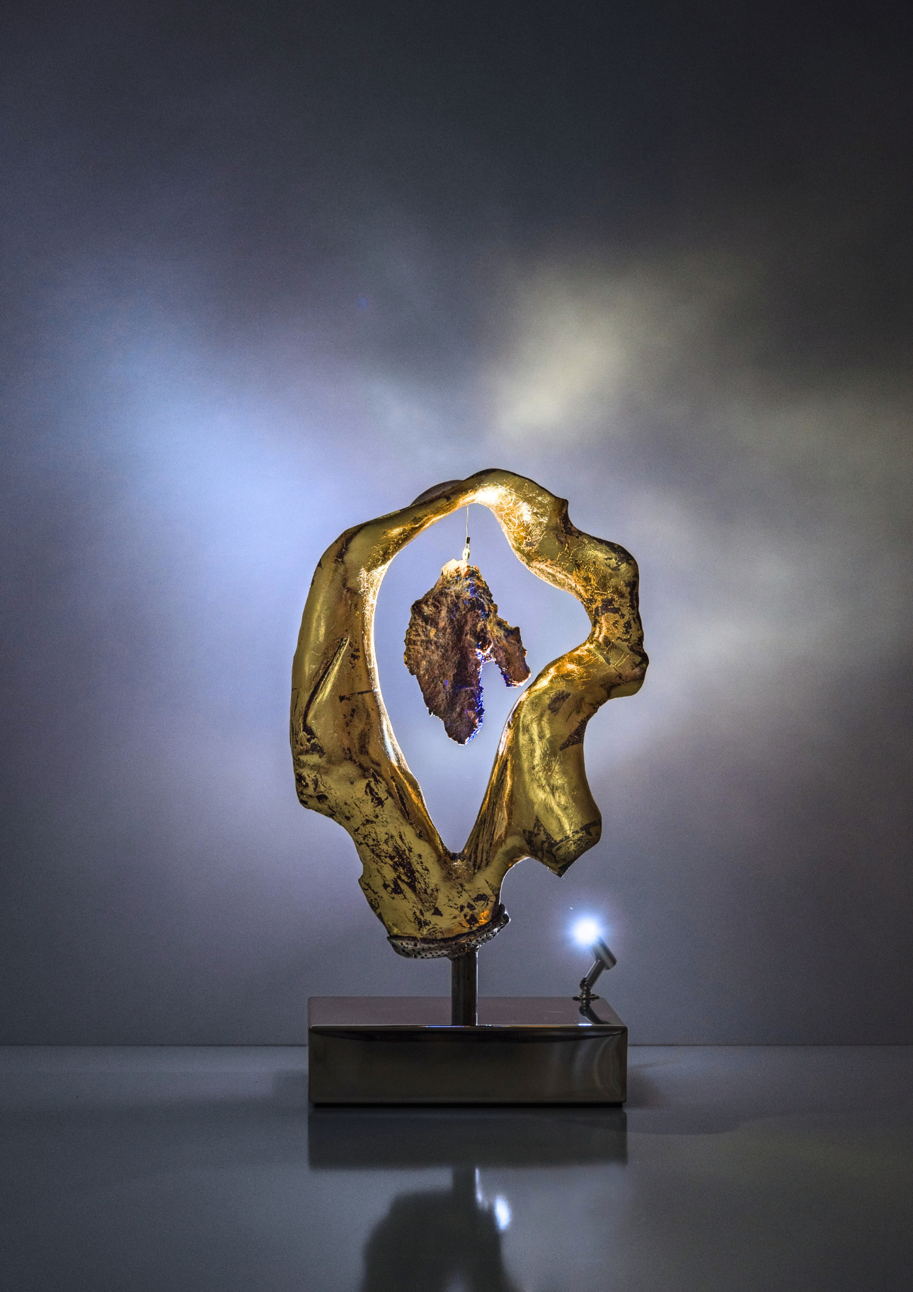 This organic modern sculpture is all about balance—natural, healing, and effortlessly luxe. Its warm, flowing form feels raw and grounded, while quartz crystals and 14K gold leaf add an uplifting energy. A soft, ambient glow enhances its calming presence, making it a statement piece that brings harmony and a touch of magic to any space.