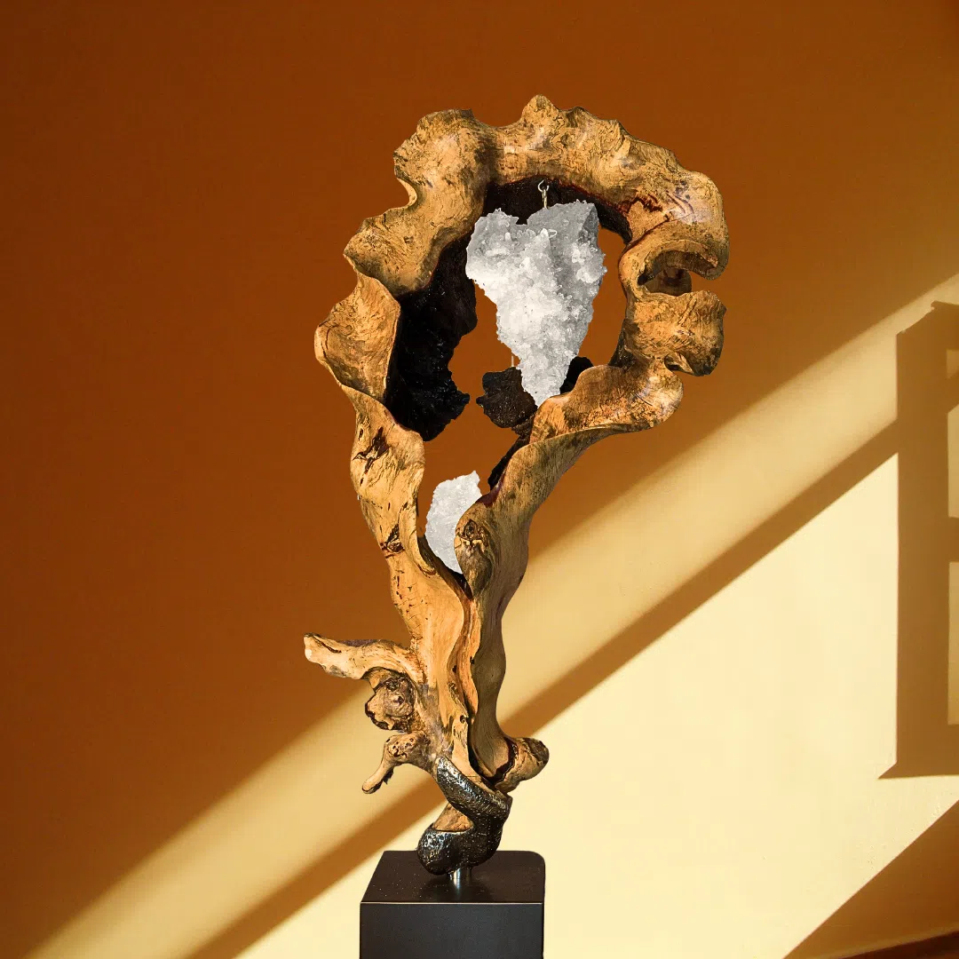 Guardians of Light combines the grounding energy of Tamarind Wood with the clarity and healing properties of White Quartz Crystal. Set on a sleek high polish stainless-steel base, the piece is illuminated by soft LED lights, enhancing its calming presence. The sculpture radiates peace, balance, and positive energy, making it an ideal addition to any space seeking tranquility and spiritual connection.