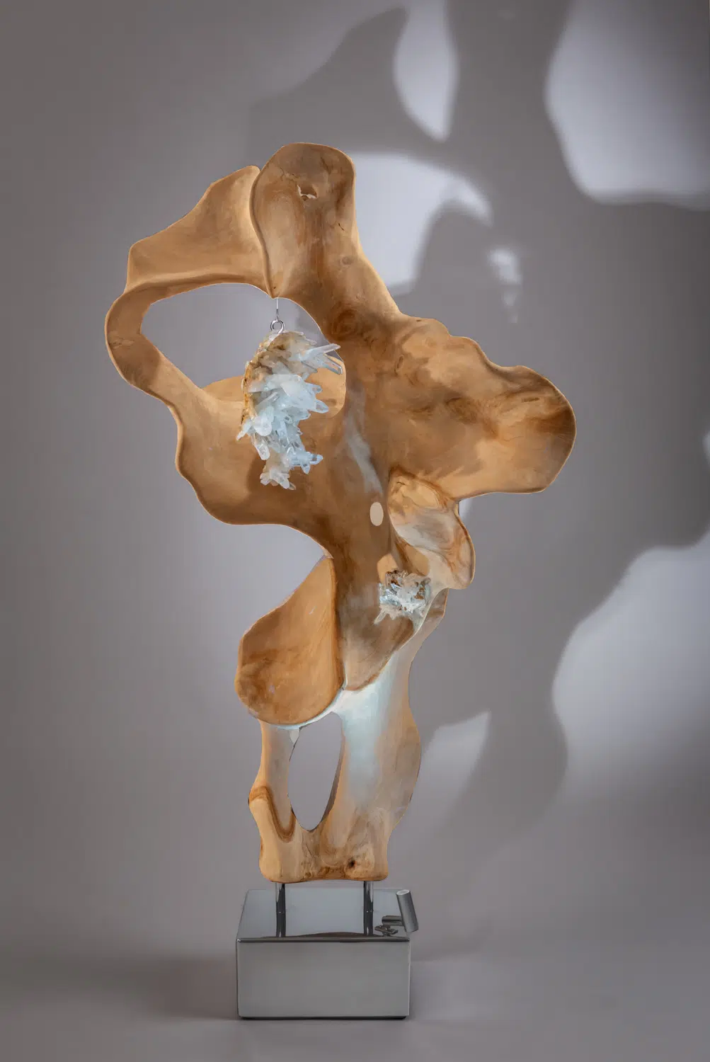 Infinite Formation II is a sculptural meditation on evolution and flow. Bleached Teak Wood, shaped by time, meets the pure clarity of Quartz Crystal in a composition that feels both ancient and transcendent. The natural lines suggest movement and transformation, while the crystal anchors the piece in light and intention. A reflection of life’s ever-unfolding journey—endlessly forming, endlessly becoming.