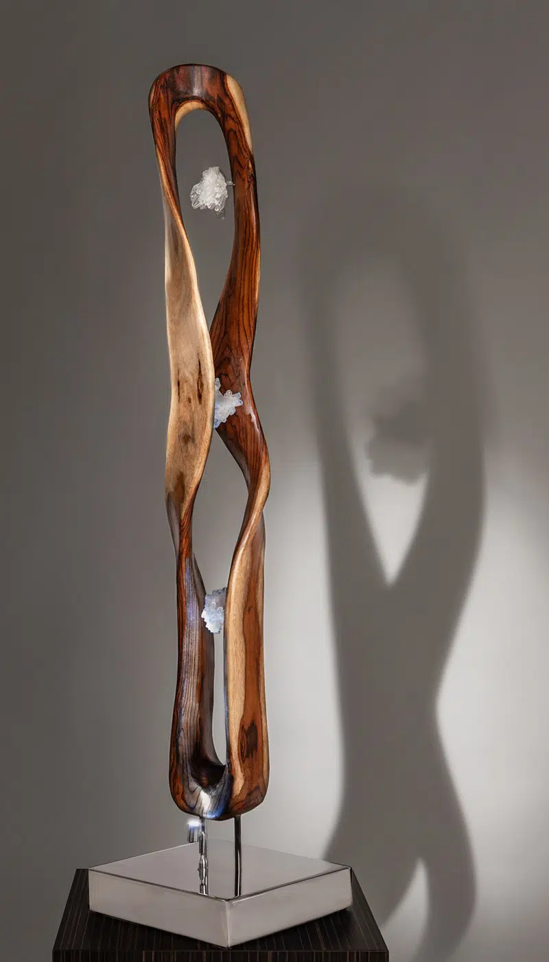 Life Energy channels the radiant pulse of nature through the grounding warmth of Indonesian Rosewood and the pure clarity of White Quartz. This piece embodies vitality, balance, and renewal—inviting presence and flow. A sculptural celebration of the force that moves through all things, now held in a new sacred space.
