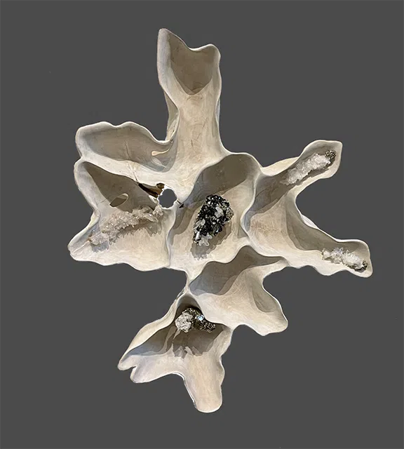 The bleached Teak wood of this piece is shaped like a star with its rays spreading out from the center in all directions. With those rays are minerals such as Pyrite and Arsenopyrite infinitely reflecting and refracting the light that it meets. This piece is representative of life, in all its joys, spreading out around the world.