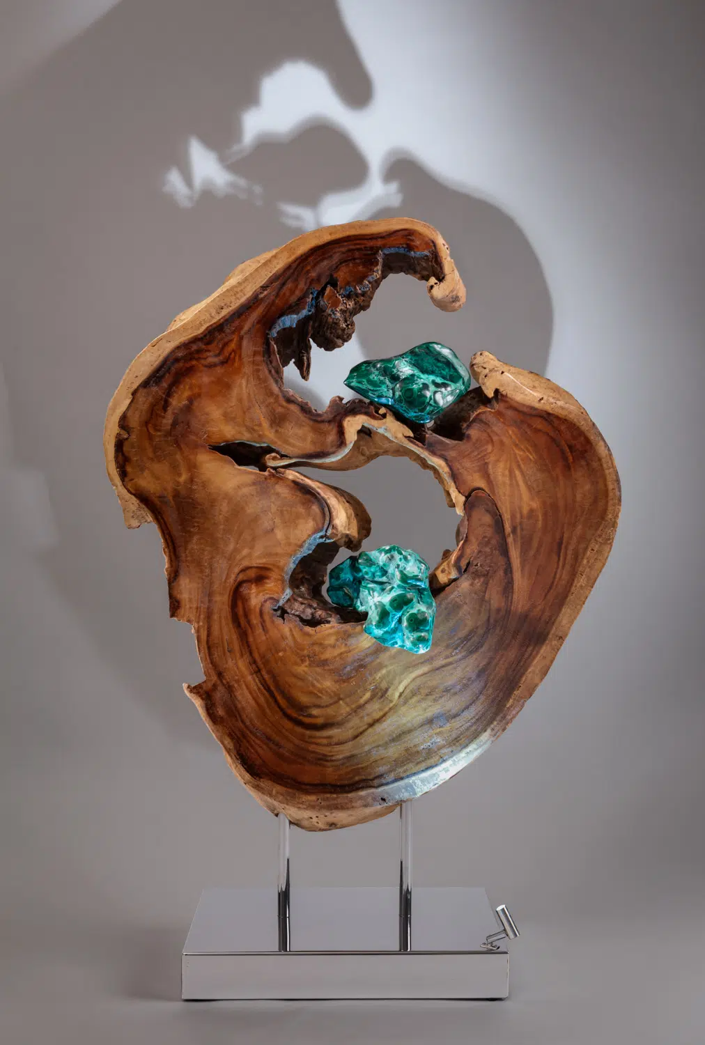 Back to The Light Within: Beauty of Crystal and Wood Sculptures Tides of Life The Light Within: Beauty of Crystal and Wood Sculptures Collection Acacia Wood, Malachite, Quartz Crystal, High Polish Stainless-Steel Base, LED Lights Sold Gallery Related Pieces Portal of Grace Constellations Sanctuary of Light Abundance of Love II