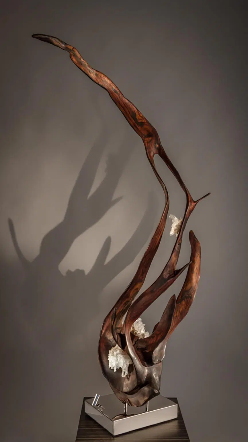 Vine of the Soul II weaves strength and spirit into one flowing form. The rich grain of Indonesian Rosewood rises in graceful movement, holding Quartz Crystal like blossoms of light. This piece speaks to the soul’s quiet growth—rooted, reaching, and radiant. A sculptural reflection of inner evolution and the beauty found in every twist of the journey.